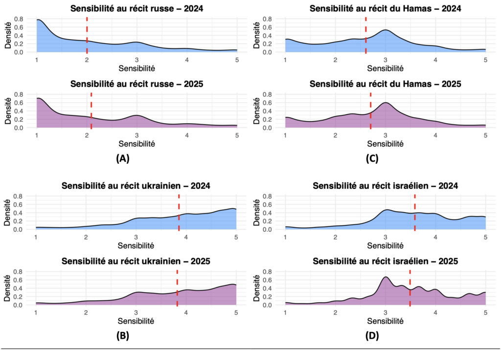 On observe cependant de faibles modulations : depuis août 2024, la sensibilité globale au récit russe a très légèrement augmenté (+0,09 point sur un continuum allant de 1 à 5), tout comme celle au récit du Hamas (+0,10 point), tandis que la sensibilité au récit israélien s’est légèrement infléchie (–0,10 point). La sensibilité au récit ukrainien est, elle, restée stable.